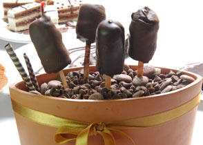 - تُوضع عيدآن الأيس كريم من أسفل ثم يُغطي بالشيكولاتهـ السآيحهـ من جميع الجهآت .