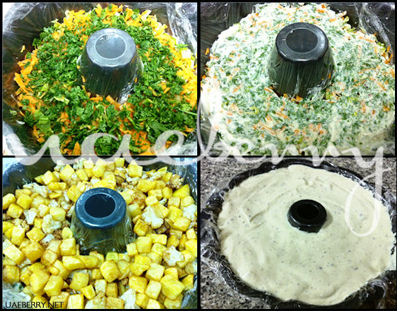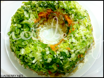 نرص شرائح الخس فالقالب وعليها طبقة من الجزر المبشوي
